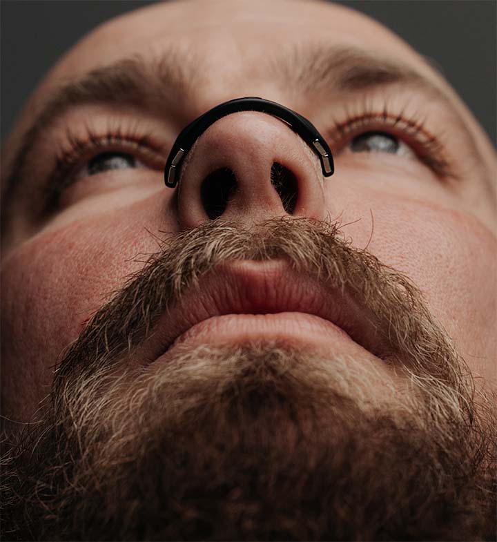 No. Nothing goes inside your nose. The band and tabs sit gently on the outside with no bridge pressure. Intake comes in multiple sizes so you can customize both airflow and comfort.